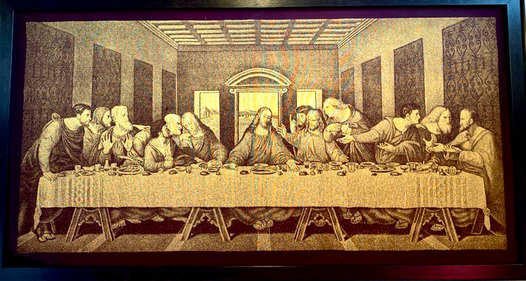 "We take immense pride in unveiling our latest masterpiece: a recreation of 'The Last Supper' transformed from mural to woven art. This iconic portrayal of biblical significance has been meticulously reimagined through the artistry of weaving, marrying tradition with innovation in a breathtaking display of workmanship.